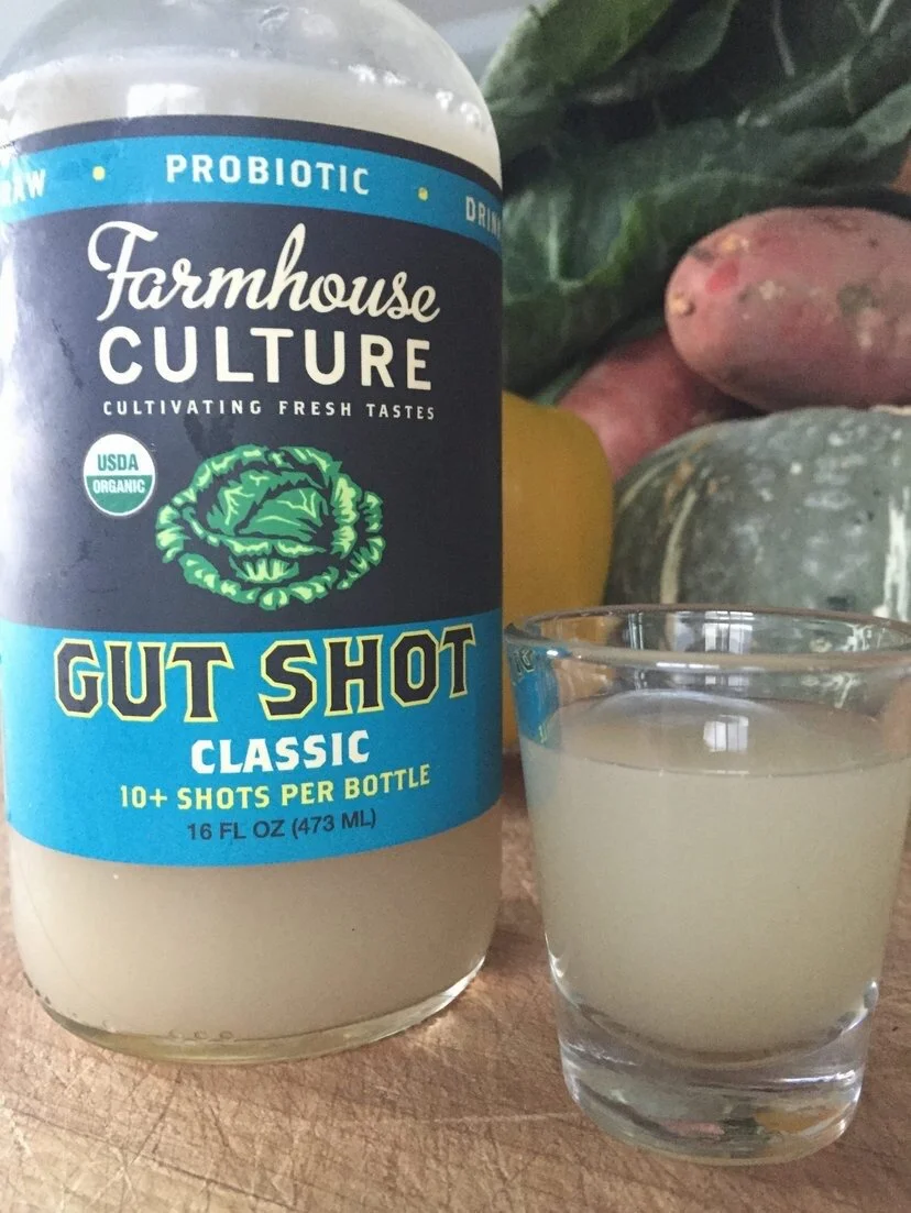 Support healthy gut flora by including high probiotic foods in your diet. Increase foods like kimchi, kefir, sauerkraut, miso, pickles, probiotic shots (Farmhouse has a great product, pictured above) and kombucha.
