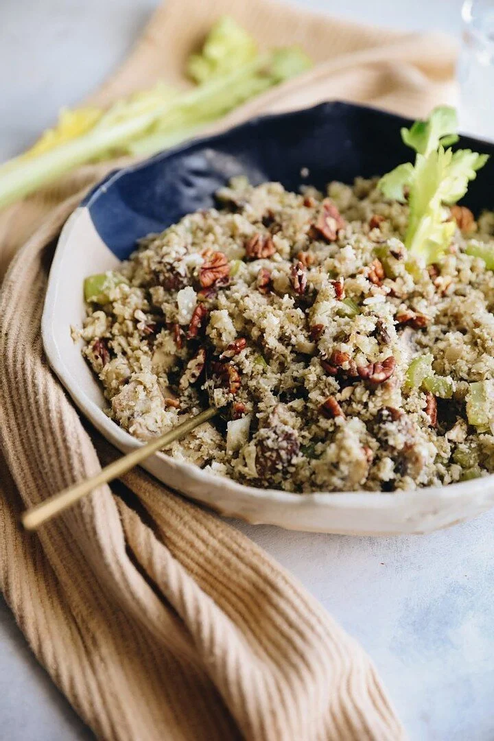 This cauliflower stuffing is free of grains, dairy, and refined carbohydrates. Instead, it’s loaded with fiber and veggies, so say good-bye to the post-Thanksgiving insulin spike and energy crash. By opting for this veggie-filled cauliflower stuffing instead of a traditional bread-loaded stuffing, you can manage gut inflammation and stay on track to healing your body!